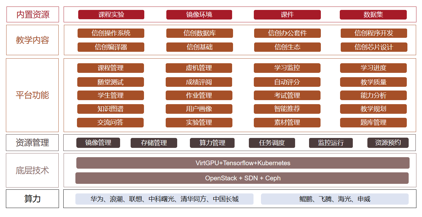 一、建設(shè)方案 高校信創(chuàng)實(shí)驗(yàn)室主要包括數(shù)智化實(shí)踐教學(xué)平臺(tái)和信創(chuàng)課程資源。 數(shù)智化實(shí)踐教學(xué)平臺(tái)采用國(guó)產(chǎn)化技術(shù),實(shí)現(xiàn)云計(jì)算資源的集中共享、統(tǒng)一調(diào)度管理的技術(shù)創(chuàng)...
