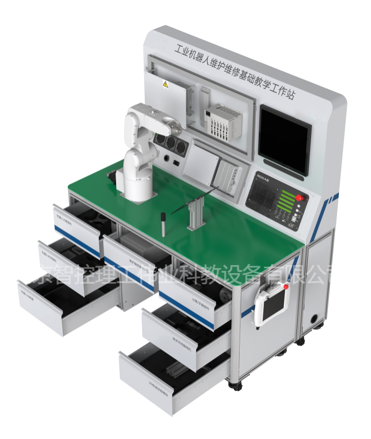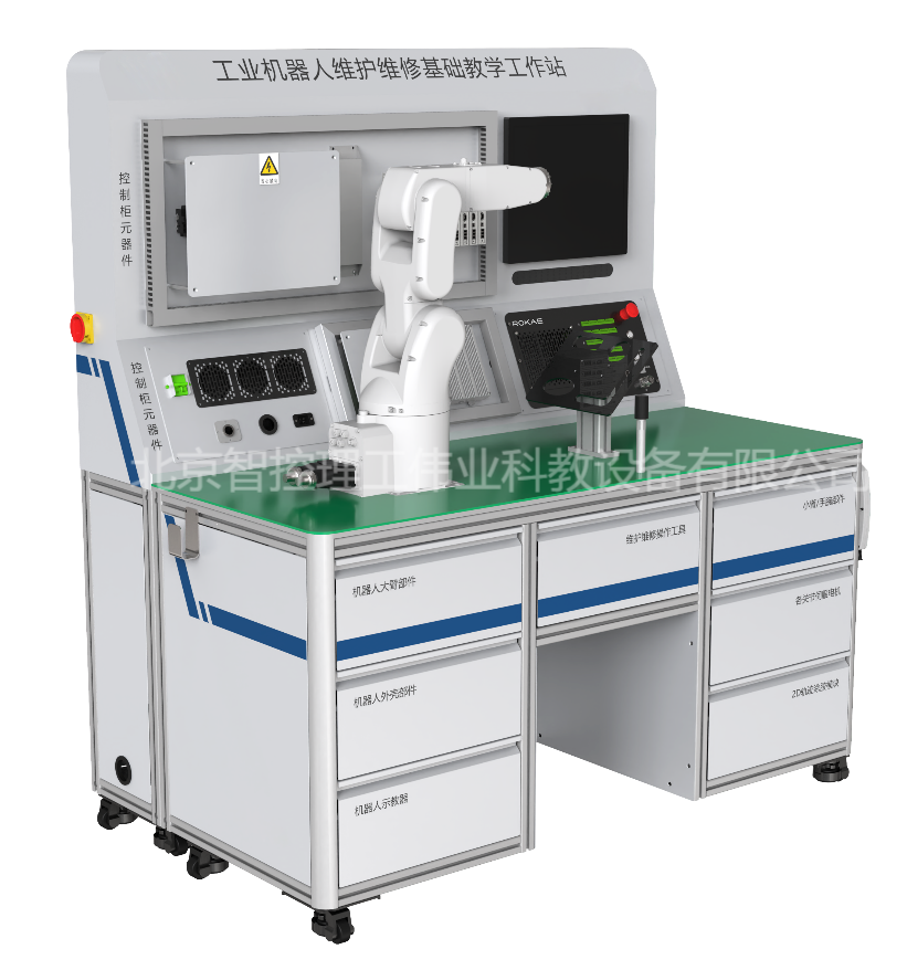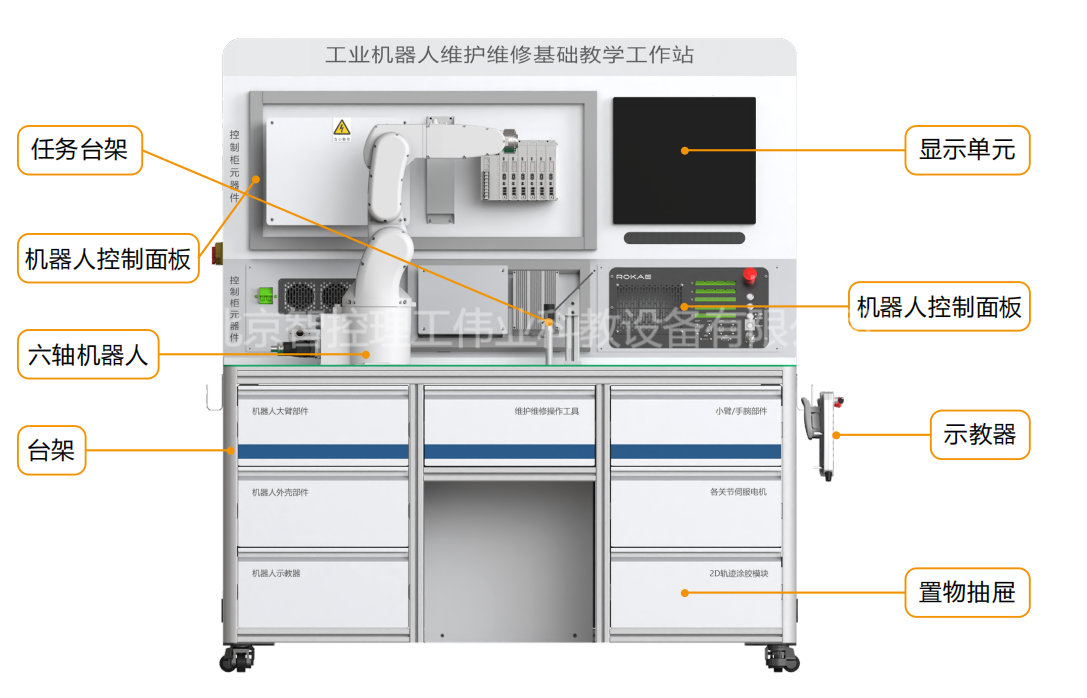 工業(yè)機器人維護維修基礎教學工作站,以工業(yè)機器人本體及其控制系統(tǒng)最常見維護維修操作為核心,通過對典型故障的診斷和排除,按照規(guī)范步驟完成對工業(yè)機器人本體的拆裝過程,并根據(jù)圖紙要求搭建控制系統(tǒng)并接線,由零件級深入了解工業(yè)機器人的構(gòu)成形式和運動方式,掌握基礎維護維修技能。工作站配套了與生產(chǎn)廠家完全相同的工裝、工具,讓學生可以在教學環(huán)境中充分體驗高精度機電設備的生產(chǎn)工藝要求,確實掌握維護維修技能。