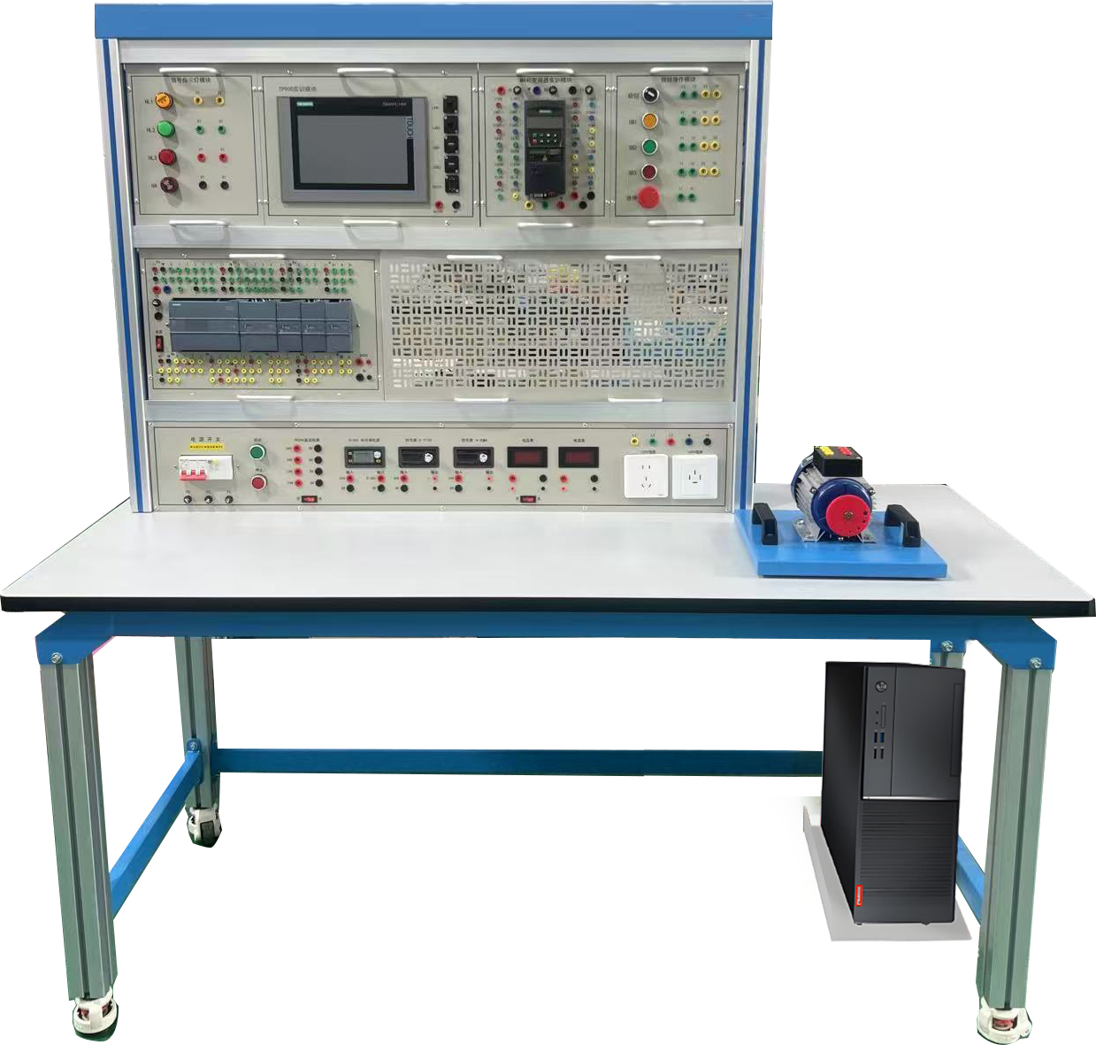 PLC實(shí)驗(yàn)裝置由控制屏、實(shí)訓(xùn)桌、主機(jī)實(shí)訓(xùn)組件、實(shí)訓(xùn)模塊(含豐富的工業(yè)現(xiàn)場設(shè)備模擬實(shí)訓(xùn)對象)、變頻器掛箱、觸摸屏掛箱、交直流電機(jī)、總線單元、通信模塊、電機(jī)導(dǎo)軌、測速機(jī)構(gòu)等組成。