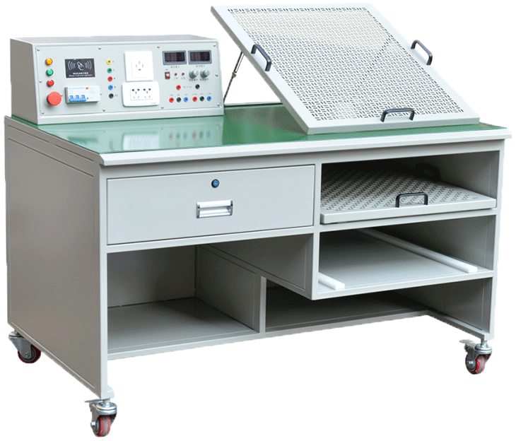 實(shí)訓(xùn)裝置由電源部分、實(shí)操部分、儲(chǔ)物部分組成。桌面設(shè)計(jì)高度750mm符合人體工程學(xué),滿(mǎn)足絕大部分使用者的使用體驗(yàn),底部裝有4個(gè)萬(wàn)向福馬輪,方便移動(dòng)和固定。