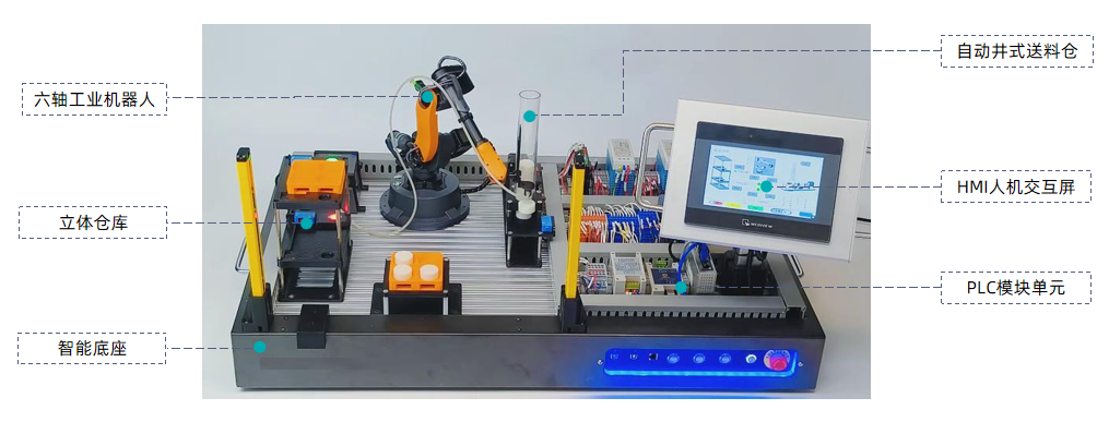 LG-JQRSX型 機(jī)器人PLC實(shí)訓(xùn)工作站由桌面級(jí)工業(yè)六軸機(jī)器人、自動(dòng)井式出料機(jī)、PLC控制模塊、立體倉(cāng)儲(chǔ)單元及HMI人機(jī)交互單元組成。