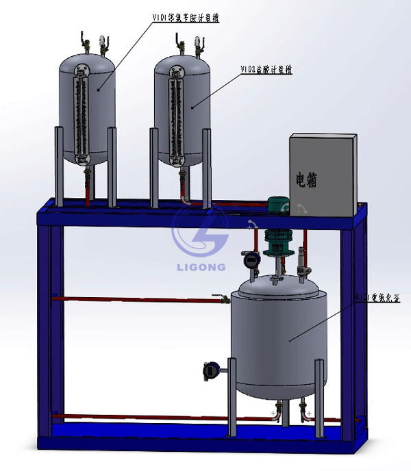 整套裝置由鋼制安裝框架、苯胺計量槽、亞硝酸鈉計量槽、冷凝器、重氮釜、仿真儀表、就地計算機操作臺、、就地智能儀表控制上位監(jiān)控軟件、外置配套設備等組成,工藝路線簡潔清晰,現(xiàn)場儀表與通訊模塊有機結合,上位計算機控制,設置DCS界面及自動評分系統(tǒng)。