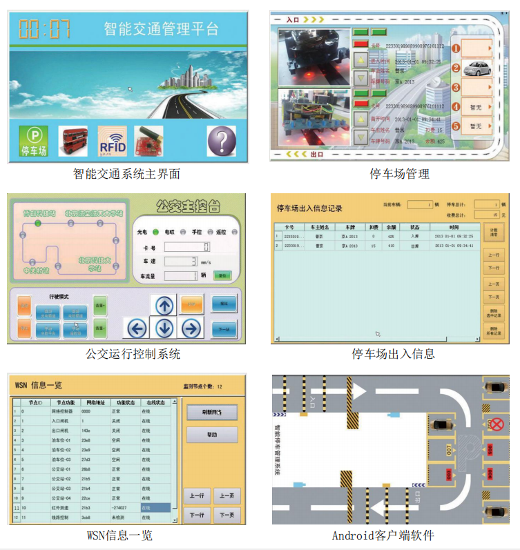 6、城市交通無(wú)線傳感網(wǎng)系統(tǒng):城市公交站、泊車位、智能公交車、停車場(chǎng)出入閘機(jī)等Zigbee節(jié)點(diǎn)與主控制器Zigbee協(xié)調(diào)器構(gòu)建無(wú)線傳感網(wǎng),實(shí)現(xiàn)數(shù)據(jù)的傳輸與狀態(tài)控制,對(duì)整個(gè)的智能交通系統(tǒng)進(jìn)行綜合信息處理與決策。