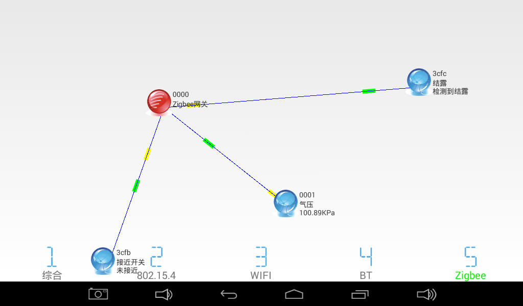 網(wǎng)關(guān)應(yīng)用軟件通過CoAP服務(wù)和串口服務(wù),將WiFi、藍(lán)牙、IEEE802.15.4、以及ZigBee感控節(jié)點(diǎn)數(shù)據(jù)解析處理,在網(wǎng)關(guān)的Mesh拓?fù)鋱D中實(shí)時(shí)流動(dòng)地顯示傳感器數(shù)據(jù)的上、下行走向;
