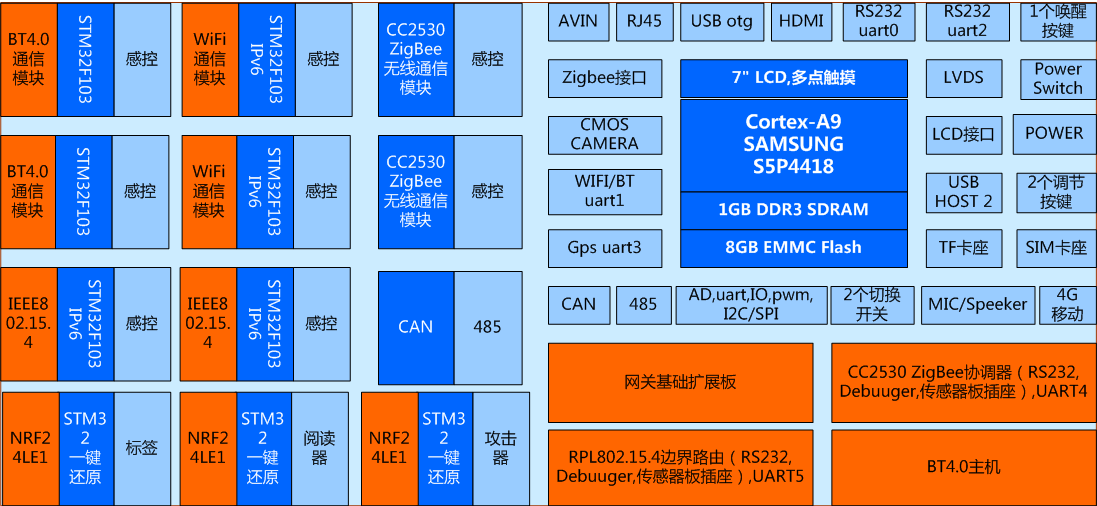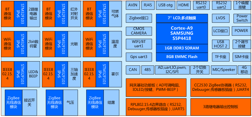 一、整體要求 1)能夠滿足單片機(jī)接口及應(yīng)用、傳感器接口及應(yīng)用、無線傳感網(wǎng)、嵌入式操作系統(tǒng)開發(fā)、嵌入式Linux應(yīng)用開發(fā)、Android移動(dòng)應(yīng)用開發(fā)等課程要求。 2)能夠組建藍(lán)牙、WiFi、IEEE802.15.4、ZigBee四種無線網(wǎng)絡(luò),實(shí)現(xiàn)數(shù)據(jù)的無線傳輸; 3)能夠?qū)⑺{(lán)牙、WiFi、IEEE802.15.4無線網(wǎng)絡(luò)經(jīng)IPV6協(xié)議、Zigbee節(jié)點(diǎn)經(jīng)ZStack協(xié)議融合在一個(gè)拓?fù)鋱D中,在界面上顯示藍(lán)牙、WiFi、RPL802.15.4、ZigBee等節(jié)點(diǎn)的傳感器數(shù)據(jù)或執(zhí)行器狀態(tài),并實(shí)時(shí)流動(dòng)地顯示各個(gè)傳感器數(shù)據(jù)的上、下行走向; 4)要求藍(lán)牙、WiFi、IEEE802.15.4三種傳感器節(jié)點(diǎn)均具有唯一的IPv6地址,統(tǒng)一采用IPv6協(xié)議組包通信。 5)要求網(wǎng)關(guān)支持Linux、Android雙操作系統(tǒng),支持一鍵燒寫、一鍵切換。 6)要求在保證網(wǎng)關(guān)接入互聯(lián)網(wǎng)的前提下,能夠配置接入云服務(wù)平臺(tái),并實(shí)現(xiàn)移動(dòng)端傳感器數(shù)據(jù)的采集顯示和執(zhí)行器的遠(yuǎn)程控制。 二、硬件資源 1.Cortex-A9網(wǎng)關(guān)(1個(gè)) 1)核心板資源: (1)CPU:Cortex-A9四核心的Samsung s5p4418,主頻1.4GHz; (2)GPU:MAIL-400,3D圖形加速 (3)內(nèi)存: 1GB DDR3; (4)EMMC: 8GB; (5)核心板+底板設(shè)計(jì):核心板加裝屏蔽罩,郵票孔方式與底板連接,抗干擾能力更強(qiáng),比插針式更穩(wěn)定可靠。要求引出核心板信號(hào)線,不少于188PIN。 2)網(wǎng)關(guān)主板資源: (1)LCD接口:7寸IPS電容屏(16:9),分辨率1024×600; (2)USB接口:2路USB_HOST 2.0輸出,1路USB OTG; (3)Ethernet接口:核心板內(nèi)置千兆IP,外加不超過3RMB的PHY芯片即可,支持10/100/1000M,RJ45接口; (4) 串口:2路3線RS232,1路TTL接口,1路RS485,1路Bluetooth; (5)CAN總線接口:1路; (6)RS485總線接口:1路; (7)HDMI 接口:HDMI1.4a,*大支持1920*1080高清數(shù)字輸出; (8)LVDS液晶屏接口:?jiǎn)瓮ǖ溃?大支持1920*1080; (9)攝像頭接口:1路CMOS并行接口,*大支持800萬像素; (10)AV接口:1路模擬視頻母口輸入; (11)外部存儲(chǔ)擴(kuò)展接口:SD卡、TF卡接口; (12)音頻接口: 1路MIC輸入,1路1. 8w喇叭; (13)按鍵:1個(gè)復(fù)位按鍵、1個(gè)休眠喚醒按鍵,2個(gè)音量鍵; (14) 藍(lán)牙WiFi:板載藍(lán)牙WiFi二合一模塊; (15)Mini PCIe接口:標(biāo)準(zhǔn)可插入4G通信模模塊; (16)24Pins應(yīng)用擴(kuò)展接口:用于處理器外設(shè)接口擴(kuò)展功能,包含3路串口、1路PWM、1路IIC、1路ADC、8個(gè)GPIO,5V電源。 2.網(wǎng)關(guān)IO基礎(chǔ)擴(kuò)展板(1個(gè)) 由網(wǎng)關(guān)直接驅(qū)動(dòng)。采用HC595串入并出特點(diǎn),使用較少IO擴(kuò)展更多功能,默認(rèn)地址0x01。1路可調(diào)電位器模擬AD采樣通道,1路PWM驅(qū)動(dòng)的蜂鳴器,5個(gè)觸摸按鍵,5個(gè)LED指示燈。 3.三路繼電器擴(kuò)展板(1個(gè)) 由網(wǎng)關(guān)直接驅(qū)動(dòng)。采用HC595串入并出特點(diǎn),使用較少IO擴(kuò)展更多功能,默認(rèn)地址0x10。 可控制3路繼電器,線圈機(jī)械式觸點(diǎn),1個(gè)常開,1個(gè)常閉,*大負(fù)載10A/277V AC。 4. ZigBee協(xié)調(diào)器(1個(gè)) 與網(wǎng)關(guān)的TTL UART連接。采用CC2530單片機(jī)外設(shè)接口、射頻通信與ZStack協(xié)議棧的方案,具備Zigbee建網(wǎng)功能,具有2個(gè)組網(wǎng)狀態(tài)及無線傳輸指示燈,2個(gè)功能按鍵,提供傳感器模塊接口、RS232接口、調(diào)試下載接口。 5. IEEE802.15.4主機(jī)(1個(gè)) 與網(wǎng)關(guān)的TTL UART連接。采用CC2530射頻功能與802.15.4的從機(jī)組建射頻網(wǎng)絡(luò),接收從機(jī)信息,向從機(jī)發(fā)送命令。具有2個(gè)組網(wǎng)狀態(tài)及無線傳輸指示燈,2個(gè)功能按鍵,提供傳感器模塊接口、RS232接口、調(diào)試下載接口。 6.無線傳感網(wǎng)通信節(jié)點(diǎn)(12個(gè)) 1)微控制器主板硬件資源 (1)Cortex-M3核心主板(9個(gè)) 處理器基于ARM Cortex-M3核心的STM32F103,*高主頻72Mhz,內(nèi)部Flash 256KB,RAM 48KB。 具有1個(gè)0.96寸OLED屏,能夠顯示MAC地址、上下級(jí)關(guān)系、傳感器數(shù)據(jù)、網(wǎng)絡(luò)信息等。 具有4個(gè)組網(wǎng)狀態(tài)及無線傳輸指示燈,2個(gè)功能按鍵、1個(gè)JTAG調(diào)試接口、1個(gè)24PIN的無線射頻接口,1組20*2PIN傳感器接口; 標(biāo)配ARM仿真器、串口下載仿真調(diào)試轉(zhuǎn)接板。 運(yùn)行IPv6協(xié)議棧實(shí)現(xiàn)無線通信的功能。 (2)CC2530核心主板(3個(gè)) 處理器基于CC2530F256,具有2個(gè)組網(wǎng)狀態(tài)及無線傳輸指示燈,2個(gè)功能按鍵、1個(gè)JTAG調(diào)試接口、1個(gè)24PIN的無線射頻接口,1組20*2PIN傳感器接口; 標(biāo)配下載仿真器。 2)無線傳感網(wǎng)通信模塊 (1)藍(lán)牙通信模塊(3個(gè)):采用UART接口的內(nèi)置協(xié)議棧方案,設(shè)置從機(jī)模式,與主機(jī)配對(duì)后,將微控制器采樣數(shù)據(jù)傳輸給主機(jī)。 (2)WiFi通信模塊(3個(gè)):采用UART接口的內(nèi)置TCP/UDP/HTTP協(xié)議棧方案,支持設(shè)置為AP、STA的工作模式,與網(wǎng)關(guān)通信后,將微控制器采樣數(shù)據(jù)傳送給主機(jī),或者接收主機(jī)的控制命令控制執(zhí)行器。 (3)IEEE802.15.4通信模塊(3個(gè)):基于CC2530射頻組網(wǎng)通信方案,與邊界路由器組網(wǎng),實(shí)現(xiàn)傳感器