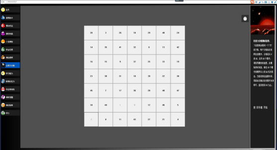 開(kāi)始測(cè)試后,屏幕中出現(xiàn) 0-48 個(gè)按照 7*7 方格隨機(jī)排列的 49 個(gè)數(shù)字,要求受試人由“0”開(kāi)始,按照從小到大的順序,在方格中依次將 0-48 之間的所有數(shù)字全部找出,找到數(shù)字后點(diǎn)擊鼠標(biāo)左鍵劃掉該數(shù)字。記錄受試者完成的時(shí)間。