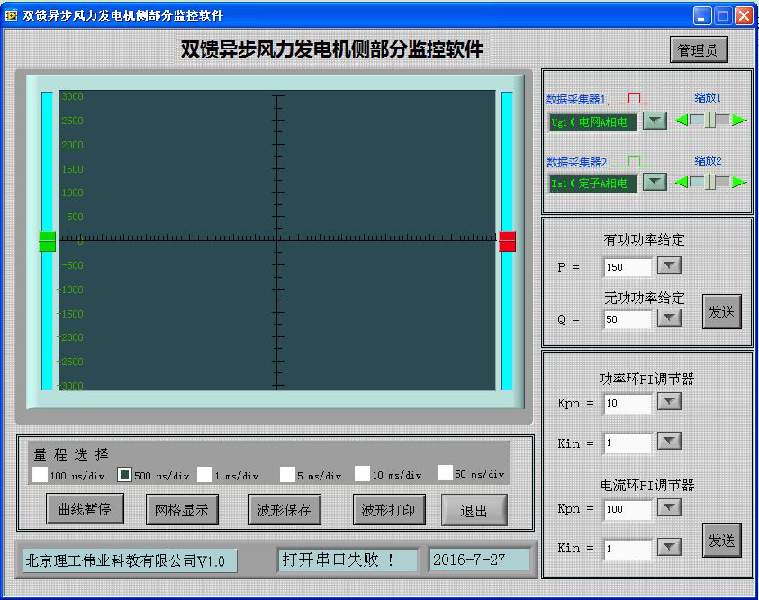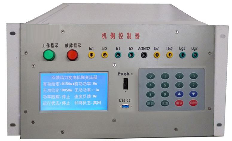 機(jī)側(cè)控制器的作用主要有兩個(gè)方面,一是給雙饋發(fā)電機(jī)的轉(zhuǎn)子提供勵(lì)磁分量的電流,從而可以調(diào)節(jié)雙饋發(fā)電機(jī)的定子側(cè)所發(fā)出的無(wú)功功率;二是通過(guò)控制雙饋發(fā)電機(jī)轉(zhuǎn)子轉(zhuǎn)矩分量的電流控制發(fā)電機(jī)的轉(zhuǎn)速或控制發(fā)電機(jī)定子側(cè)所發(fā)出的有功功率,從而使發(fā)電機(jī)運(yùn)行在風(fēng)力機(jī)的*佳功率曲線(xiàn)上,實(shí)現(xiàn)*大風(fēng)能追蹤(捕獲)運(yùn)行。機(jī)側(cè)控制器面板安裝有兩個(gè)信號(hào)指示燈,16鍵PVC軟鍵盤(pán),240*128點(diǎn)蘭色液晶屏及9個(gè)波形測(cè)試端子。信號(hào)指示燈可對(duì)控制器工作、保護(hù)狀態(tài)分別指示;鍵盤(pán)可完成機(jī)側(cè)控制器啟動(dòng)/停止設(shè)置,*大功率啟動(dòng)/停止跟蹤設(shè)置,有功/無(wú)功給定,手動(dòng)并網(wǎng)/離網(wǎng);液晶屏可顯示轉(zhuǎn)速反饋值,有功/無(wú)功反饋值;波形測(cè)試端子可通過(guò)示波器觀(guān)測(cè)發(fā)電機(jī)機(jī)轉(zhuǎn)子、定子相電流波形,可觀(guān)測(cè)發(fā)電機(jī)定子相電壓、電網(wǎng)相電壓波形。
