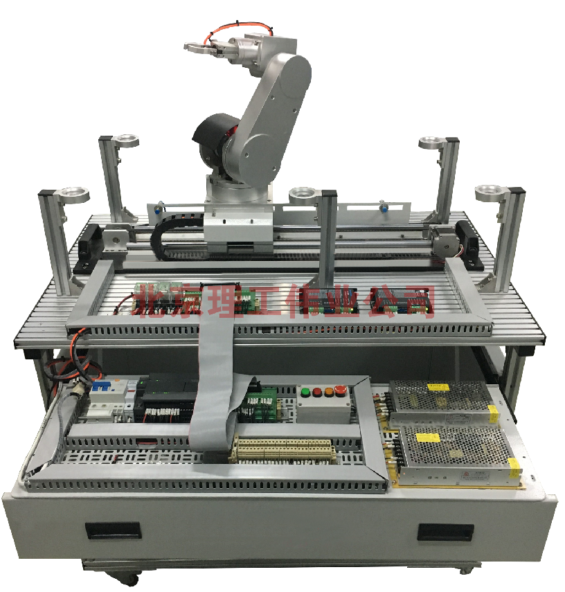 五軸機器人實訓(xùn)系統(tǒng)由型材實訓(xùn)桌、五自由度機器人及電氣控制三部分組成。五自由度機器人運動機械部分包括底座水平移動、底座旋轉(zhuǎn)、大臂上下擺動、小臂上下擺動、手爪旋轉(zhuǎn),用于實現(xiàn)定位功能,手爪夾緊與松開,采用電動手爪,伺服電機驅(qū)動,齒輪傳動,開閉角度自由控制,可對直徑60mm以內(nèi)的任意物體進行抓取,具有力矩保持、速度可調(diào)等特點。桌面設(shè)有六個工位臺,在教學(xué)過程中可根據(jù)考核要求,調(diào)節(jié)工作臺位置點。