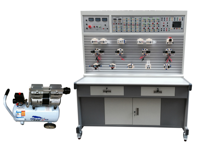 2、實訓臺:雙面鋁材結(jié)構(gòu)平臺,主要用于安裝液壓氣動相關(guān)元件,型材表面有標準的兩道固定槽,最上面層主要以電氣控制位置。