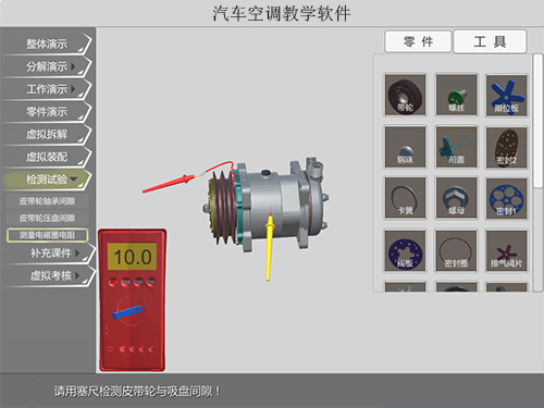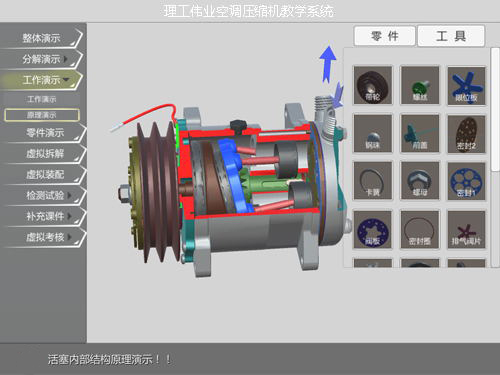 空調(diào)壓縮機(jī)虛擬仿真教學(xué)系統(tǒng) 選用空調(diào)壓縮機(jī)的實物進(jìn)行1:1的建模,從各大院校對汽車空調(diào)壓縮機(jī)的教學(xué)要求出發(fā),采用三維仿真教學(xué)風(fēng)格,空調(diào)壓縮機(jī)可以在虛擬仿真...汽車空調(diào)教學(xué)軟件