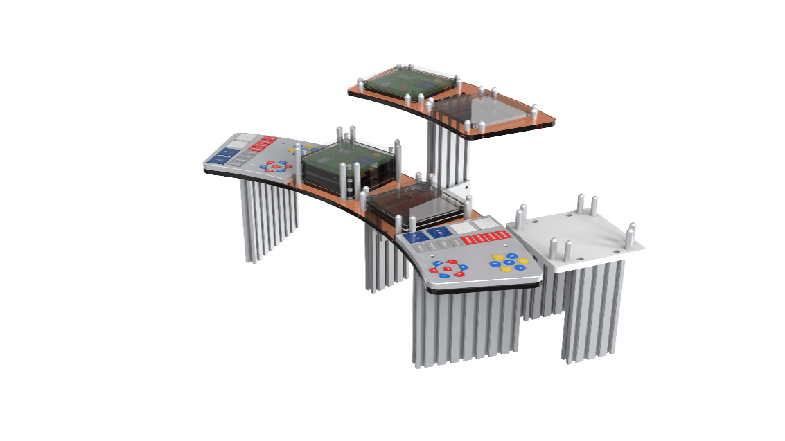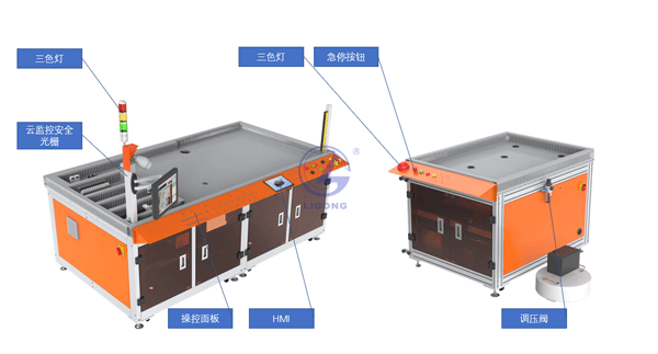 設(shè)備架體用于支持各單元,上臺面為型材臺面,各單元可方便在臺面安裝。具有腳輪,可用于移動設(shè)備。上面安裝有云監(jiān)控安全光柵、三色燈,另一臺架控制面板上也具有三色燈,用于顯示協(xié)作機(jī)器人運(yùn)行狀態(tài)??刂泼姘灏惭b有急停開關(guān),可在緊急情況下快速停止設(shè)備。架體前方可開門,可放置工具、行星裝配模塊、2D軌跡訓(xùn)練單元、3D軌跡訓(xùn)練單元等物品。如圖所示。