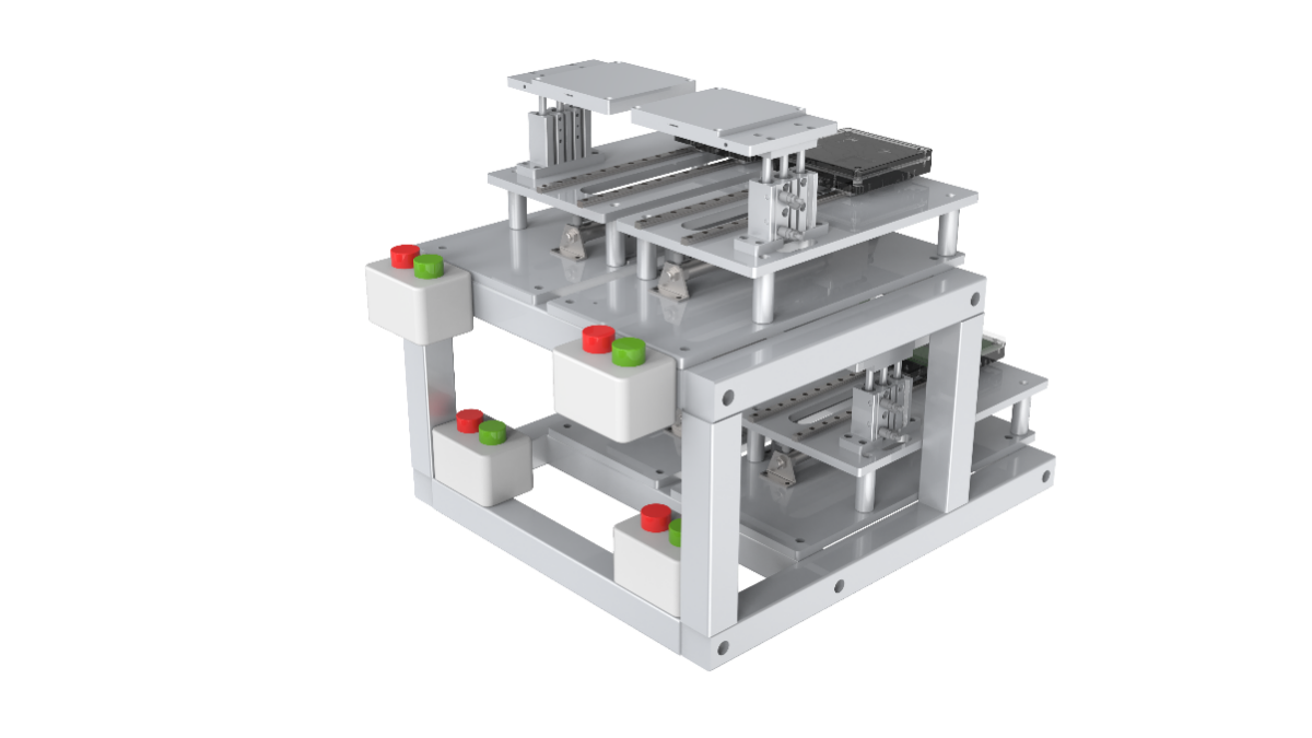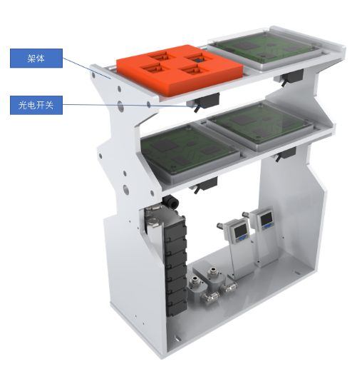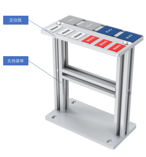 緩存單元是機(jī)器人將分揀后的芯片放入定位板內(nèi);可以根據(jù)需求設(shè)定,讓機(jī)器人取揀選不同的芯片放至對應(yīng)的槽位。由支撐架體、定位板等組成。如圖所示。