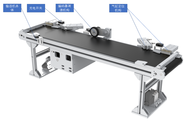 皮帶輸送單元是設(shè)備的重要組成部分,負(fù)責(zé)接駁CPU托盤的運(yùn)輸,包括輸送機(jī)本體、氣缸定位機(jī)構(gòu)、編碼器測速機(jī)構(gòu)、光電開關(guān)等組件構(gòu)成,如圖所示。芯片托盤在兩端位置可以用氣缸定位機(jī)構(gòu)定位,方便機(jī)器人精準(zhǔn)上料,編碼器可以實(shí)時(shí)測得皮帶線速度,以結(jié)合機(jī)器人和視覺相機(jī)進(jìn)行動態(tài)抓取及物料識別。側(cè)面具有光電開關(guān),可檢測芯片托盤位置。如圖所示