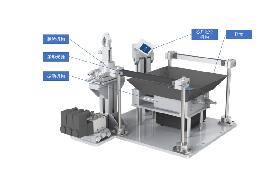 芯片供料單元由料盒、翻轉(zhuǎn)機(jī)構(gòu)、芯片定位機(jī)構(gòu)、條形光源等組成。芯片可以在翻轉(zhuǎn)機(jī)構(gòu)上進(jìn)行正反方向改變,料盒振動功能,由氣缸伸縮實(shí)現(xiàn)。可實(shí)現(xiàn)芯片的重新排列。料盒兩側(cè)具有條形光源,可補(bǔ)償外部環(huán)境對于視覺的干擾。芯片定位機(jī)構(gòu)是利用芯片的自重可進(jìn)行二次定位,以便于協(xié)作機(jī)器人精準(zhǔn)取放。如圖所示