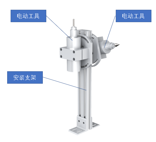 加工單元由安裝架體、銑刀電動工具、打磨電動工具等組成,可對零件表面進(jìn)行銑削以及打磨,并且兩個(gè)工具都可以調(diào)整角度,方便與機(jī)器人進(jìn)行角度配合。非常詳細(xì)的展示實(shí)際生產(chǎn)中這兩種不同的加工工藝,極大的加深了學(xué)生對兩種工藝?yán)斫夂驼J(rèn)知。如圖所示。