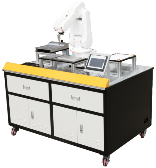 隨著現(xiàn)代制造業(yè)和服務(wù)業(yè)的轉(zhuǎn)型升級,工業(yè)機(jī)器人在測量檢驗(yàn)、包裝、分揀處理、搬運(yùn)、碼垛、填裝、機(jī)器上下料、裝配、金屬切割、焊接、噴涂等領(lǐng)域得到了越來越多的應(yīng)用。在不同領(lǐng)域的應(yīng)用會對機(jī)器人的安裝、編程、調(diào)試人員提出了不同的要求。根據(jù)這一工作的需要設(shè)計(jì)了LGY-JC02B型工業(yè)機(jī)器人基礎(chǔ)實(shí)訓(xùn)設(shè)備。該設(shè)備是由一臺六軸工業(yè)機(jī)器人、書寫工作站、曲面軌跡工作站、碼垛工作站、實(shí)訓(xùn)桌、電氣控制部分組成。設(shè)備全部采用工業(yè)標(biāo)準(zhǔn)電氣設(shè)備進(jìn)行安裝生產(chǎn)且為當(dāng)今自動化主流設(shè)備,該設(shè)備能完成由現(xiàn)實(shí)工業(yè)生產(chǎn)轉(zhuǎn)變?yōu)榭晒W(xué)生學(xué)習(xí)的高仿真度的現(xiàn)場工作環(huán)境,培養(yǎng)學(xué)生的認(rèn)知能力及學(xué)習(xí)能力,使學(xué)生一進(jìn)入該領(lǐng)域即可快速適應(yīng)現(xiàn)實(shí)中的生產(chǎn)物流環(huán)節(jié),提高學(xué)生的競爭力。