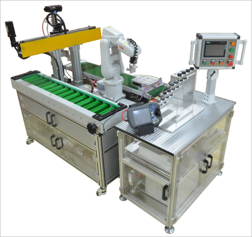 該設(shè)備主要由ABB120工業(yè)機器人、混合式流水線(皮帶式、滾筒式)、物料轉(zhuǎn)換臺、直角坐標(biāo)上下料機械臂、機器人底座、機器人配套工裝夾具、電氣控制柜以及配套的各種實訓(xùn)模塊單元等組成。