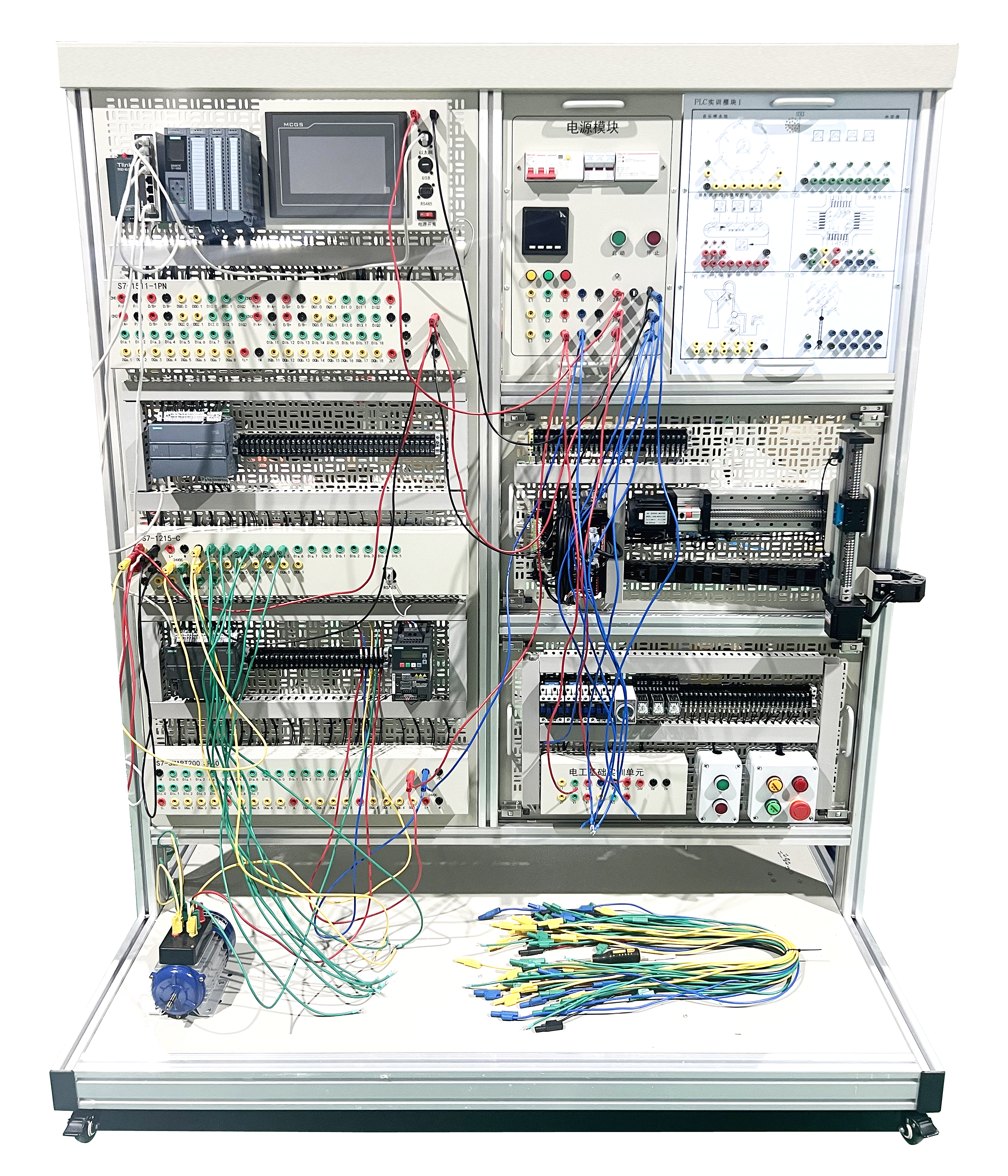 3. 采用模塊組合式結(jié)構(gòu),含開關(guān)量、模擬量、變頻調(diào)速、觸摸屏、通信模塊等,配套工控組態(tài)監(jiān)控軟件,實(shí)現(xiàn)仿真化、信息化實(shí)訓(xùn)教學(xué)。