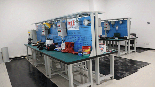 設備是由防爆柜、防靜電操作臺、防爆箱、防爆電阻箱、隔爆型防爆燈、增安型防爆燈、本安型防爆燈、防爆接線盒、防爆電動機、接地桶、密封圈、防火泥、防爆撓性管、封堵件、防爆電阻箱被測電流回路(防爆白熾燈,用硬導線連接)、防爆儀表(萬用表/防爆型、萬用表/普通型指針式、兆歐表500V/防爆型、兆歐表1000V/防爆型、兆歐表500V/普通型、兆歐表1000V/普通型、鉗形電表/防爆型、鉗形電表/普通型數字式、接地電阻測試儀/防爆型、接地電阻測試儀/普通型數字式)、防毒面具、防護眼鏡、安全帶、絕緣鞋、安全帽、攜帶式接地線、低壓驗電筆等組件構成。