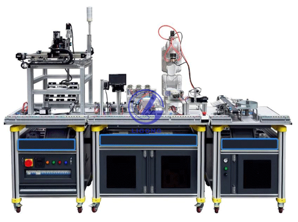 LGY-JD05型 通用機(jī)電設(shè)備安裝與調(diào)試實(shí)訓(xùn)裝備主要由實(shí)訓(xùn)臺架、典型的機(jī)電設(shè)備的機(jī)械部件, 電氣控制單元等組成。典型的機(jī)電設(shè)備的機(jī)械部件主要包括供料機(jī)構(gòu)、傳送帶輸送分揀機(jī)構(gòu)、工業(yè)機(jī)器人、直角坐標(biāo)機(jī)械手、立體倉庫以及可擴(kuò)展的模擬生產(chǎn)設(shè)備實(shí)訓(xùn)模塊等; 電氣控制單元主要有電源配電、PLC 可編程控制器、觸摸屏、變頻器、步進(jìn)電機(jī)控制、伺服電機(jī)控制、按鈕指示燈、接線端子及各種檢測傳感器等部分組成。整體結(jié)構(gòu)采用開放式和拆裝式,可根據(jù)現(xiàn)有的機(jī)械部件,以模塊化的方式組裝和搭建具有生產(chǎn)功能的智能生產(chǎn)線設(shè)備,也可添加其它機(jī)械部件組裝其他生產(chǎn)設(shè)備,使整個裝置能夠靈活的按教學(xué)實(shí)訓(xùn)要求組裝具有模擬生產(chǎn)功能的智能生產(chǎn)線設(shè)備。