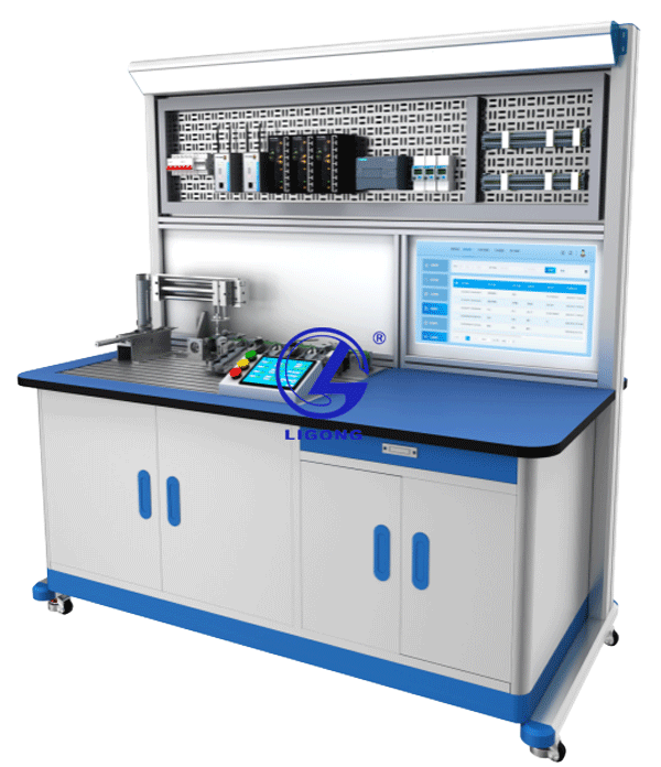 本設備采用鋁合金結構搭建而成,桌面采用導軌式鋁型材和實芯板拼接而成,導軌式鋁型材桌面用于安裝機電一體化控制對象,實芯板桌面用于放置電腦和學生學習之用。工作臺前立面用于安裝電源裝置和電氣控制系統(tǒng)及扁平等。安裝版采用網(wǎng)孔板的形式,固定方式為窗戶開關結構,方便學員安裝和檢修電控系統(tǒng)。