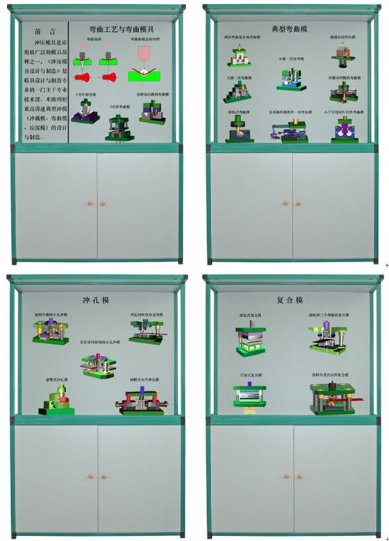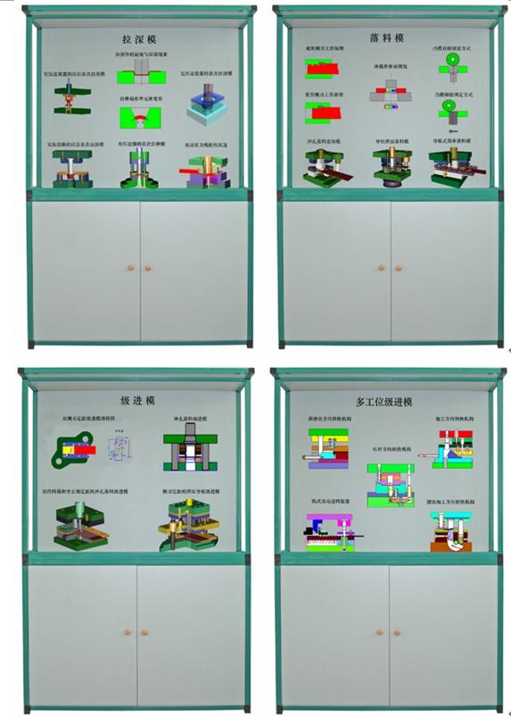 CLG-N04型 多媒體智能控制《沖壓模具設(shè)計(jì)與制造》陳列柜是模具設(shè)計(jì)與制造專業(yè)的一門主干專業(yè)技術(shù)課。適用于《沖壓模具設(shè)計(jì)與制造》、《沖模設(shè)計(jì)應(yīng)用實(shí)例》等課程。本課程是以教育部高教司《關(guān)于加強(qiáng)高職高專人才培養(yǎng)工作的若干意見》等文件對(duì)高職高專人才培養(yǎng)的要求為指導(dǎo)思想。采用多種素材和媒體手段,講述典型沖模(沖裁模、彎曲模、拉深模)的設(shè)計(jì)與制造,適度介紹了多工位級(jí)進(jìn)模設(shè)計(jì)與制造。陳列柜共分八個(gè)柜和一個(gè)電腦控制臺(tái),進(jìn)行多媒體聲控同步解說演示。柜內(nèi)47件模型均采用動(dòng)畫圖像由PC電腦軟件控制順序或任選播放演示沖壓模具功能原理。