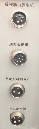 (1)動力系統(tǒng)接口單元操作面板主要由四個開爾文插座組成,從上到下依次為五芯、七芯、 三芯和四芯插座。分別用于連接系統(tǒng)動力源電機、動力頭電機、自動打標機電機(含急停按鈕)、 電磁離合器(含限位開關)。