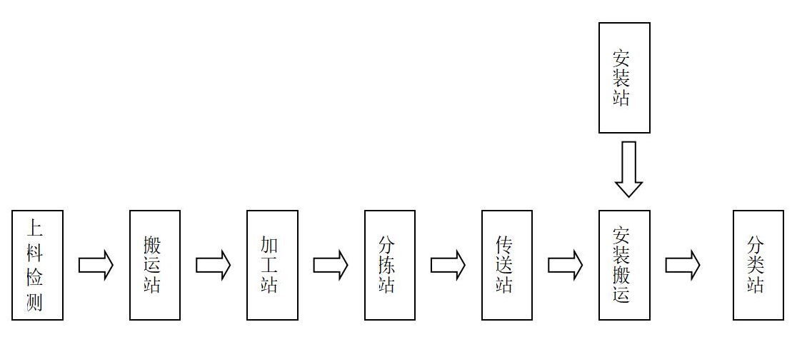 下圖給出了系統(tǒng)中工件從一站到另一站的物流傳遞過程:上料檢測單元將大工件按順序排好后提升送出;搬運站將大工件從上料檢測單元搬至加工站;加工站將大工件加工后送出工位;分揀站將加工過的正常的工件搬運到傳送站,如果是廢料,分揀機械手將工件搬運到廢料處理機構(gòu);傳輸站將正常的大工件送至尾端,將廢料分揀到廢料槽里;安裝搬運站將大工件從傳輸站搬至安裝工位放下。安裝站再將對應(yīng)的小工件裝入大工件中。而后,安裝搬運站再將安裝好的工件送分類站,分類站再將工件送入相應(yīng)的料倉。