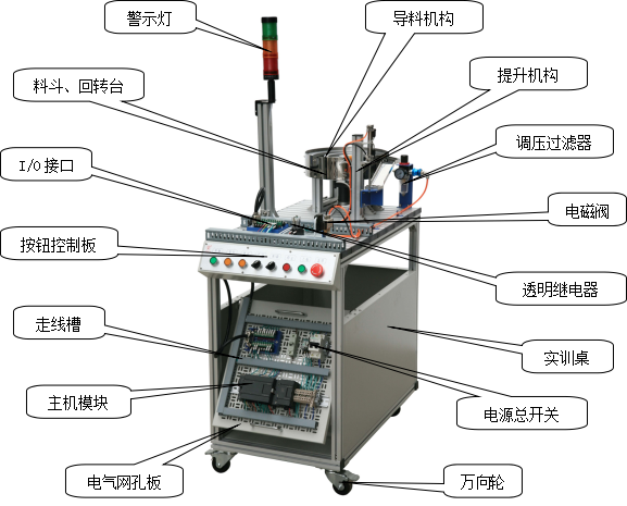 由料斗、回轉(zhuǎn)臺、導(dǎo)料機構(gòu)、平面推力軸承、工件滑道、提升裝置、檢測工件和顏色識別光電開關(guān)、開關(guān)電源、可編程序控制器、按鈕、I/O接口板、通訊接口板、電氣網(wǎng)孔板、直流減速電機、電磁閥及氣缸組成,主要完成將工件從回傳上料臺依次送到檢測工位,提升裝置將工件提升并檢測工件顏色。