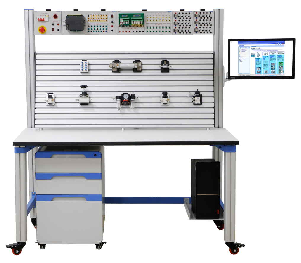 (1)采用工業(yè)鋁型材框架設(shè)計,設(shè)有工業(yè)鋁合金型材操作面板,主要用于安裝氣動相關(guān)元件;操作面板型材表面有標準的兩道固定槽,兩道之間距離40mm,最上面層主要用以放置電源控制模塊及電氣控制模塊,桌面為防火、防水、耐磨高密度板。