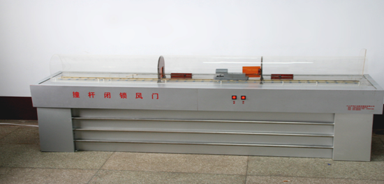 該井下各種風(fēng)門演示裝置(適合于二、三、四級),采用電傳動,使電機車在軌道行走,演示各種閉鎖風(fēng)門的開關(guān)原理。