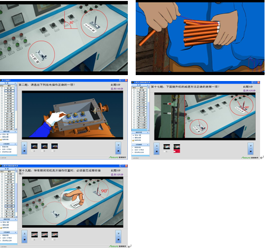 “煤礦特殊工種可視化實(shí)操模擬演示系統(tǒng)”學(xué)習(xí)模塊包括煤礦安全理論知識(shí)、安全基礎(chǔ)技術(shù)知識(shí)、生產(chǎn)專業(yè)技術(shù)知識(shí)、生產(chǎn)專業(yè)技能操作、自救互救與創(chuàng)傷急救等內(nèi)容。素材庫綜合利用文字解說、圖形圖像、影音視頻、二三維動(dòng)畫、虛擬仿真等多種形式,把煤礦一般從業(yè)人員、特種作業(yè)人員、煤礦主要負(fù)責(zé)人及生產(chǎn)管理人員等相關(guān)內(nèi)容,通過圖文并茂、視聽結(jié)合、虛擬互動(dòng)的方式,將復(fù)雜枯燥的知識(shí)點(diǎn)通俗生動(dòng)的表現(xiàn)出來。使學(xué)習(xí)內(nèi)容有形有聲有色,具有很強(qiáng)的直觀性。