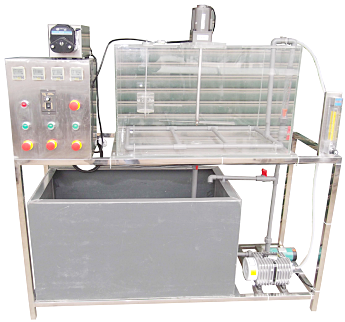反應池、曝氣頭、抽吸泵、氣泵、水泵、流量計、配水箱、穿孔曝氣器、不銹鋼可移動框架、控制屏。
