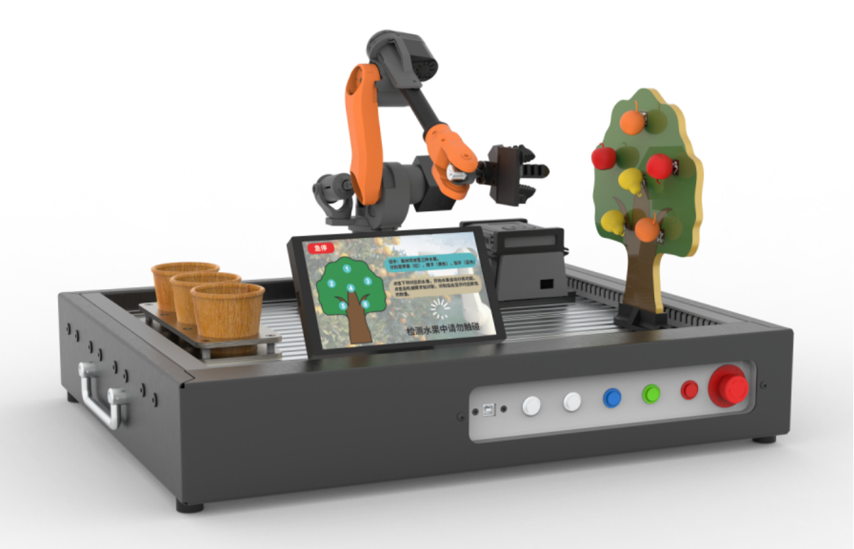 水果采摘機(jī)器人是機(jī)器人在農(nóng)業(yè)領(lǐng)域的典型應(yīng)用場景。該智能水果采摘機(jī)器人由擁有標(biāo)準(zhǔn)工業(yè)機(jī)器人外形的桌面級六軸機(jī)器人、機(jī)器人末端視覺及果樹組成。機(jī)器視覺模塊作為機(jī)器人的視覺感知模塊識別果樹不同果實類別及位置,機(jī)器人實現(xiàn)抓取及分揀工作。